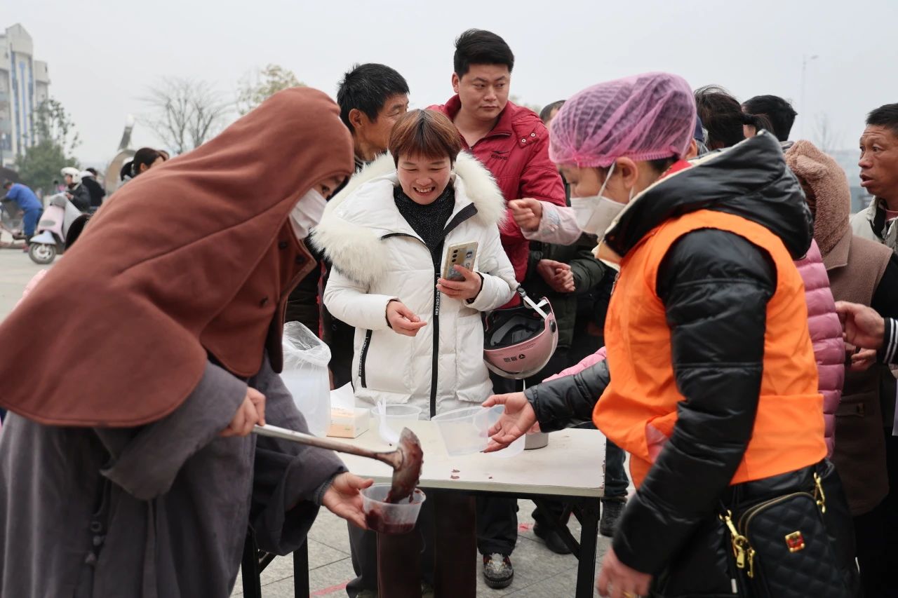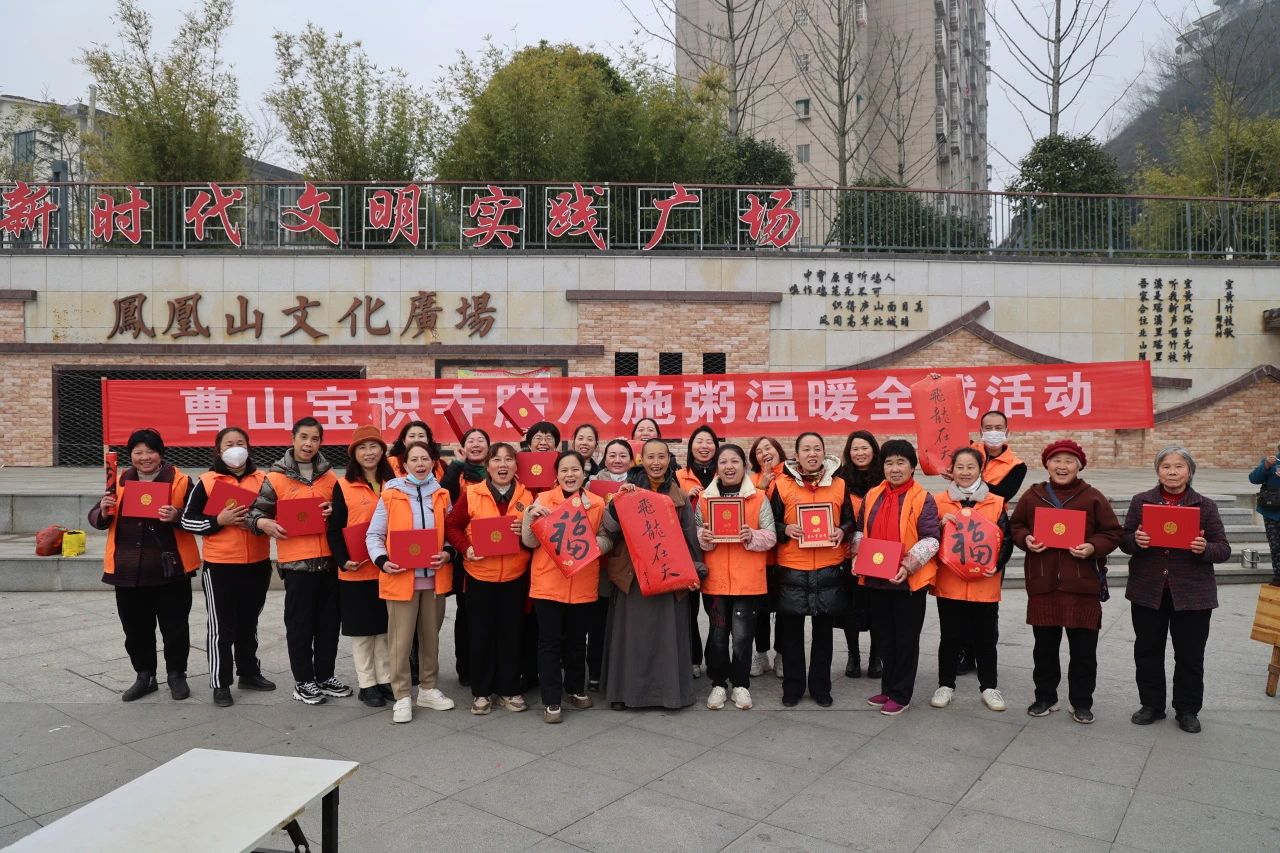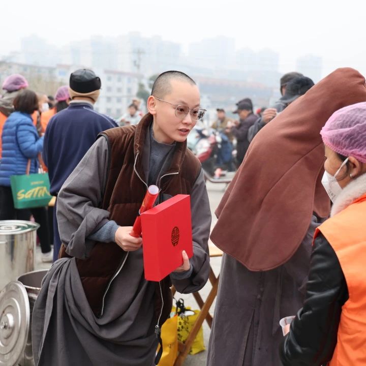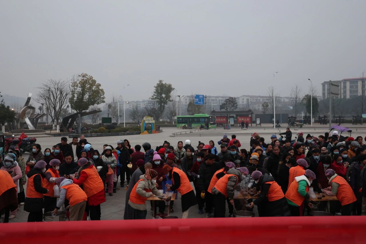 香浓的七宝五味粥和载着曹山大众法师们满满的祝福,被送到了宜黄县凤凰山文化广场,人群在义工的引导下排起了长队。
